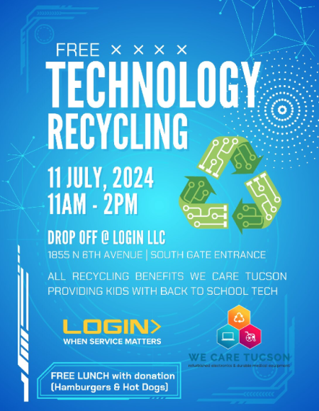 Login is hosting a FREE technology equipment recycling drop-off event in partnership with We Care Tucson to help kids with Back to School. It isn’t always safe to simply throw old technology away as there are many potentially harmful chemicals and metals. We Care Tucson can recycle them safely.